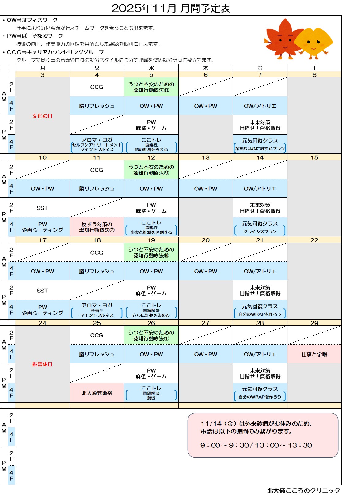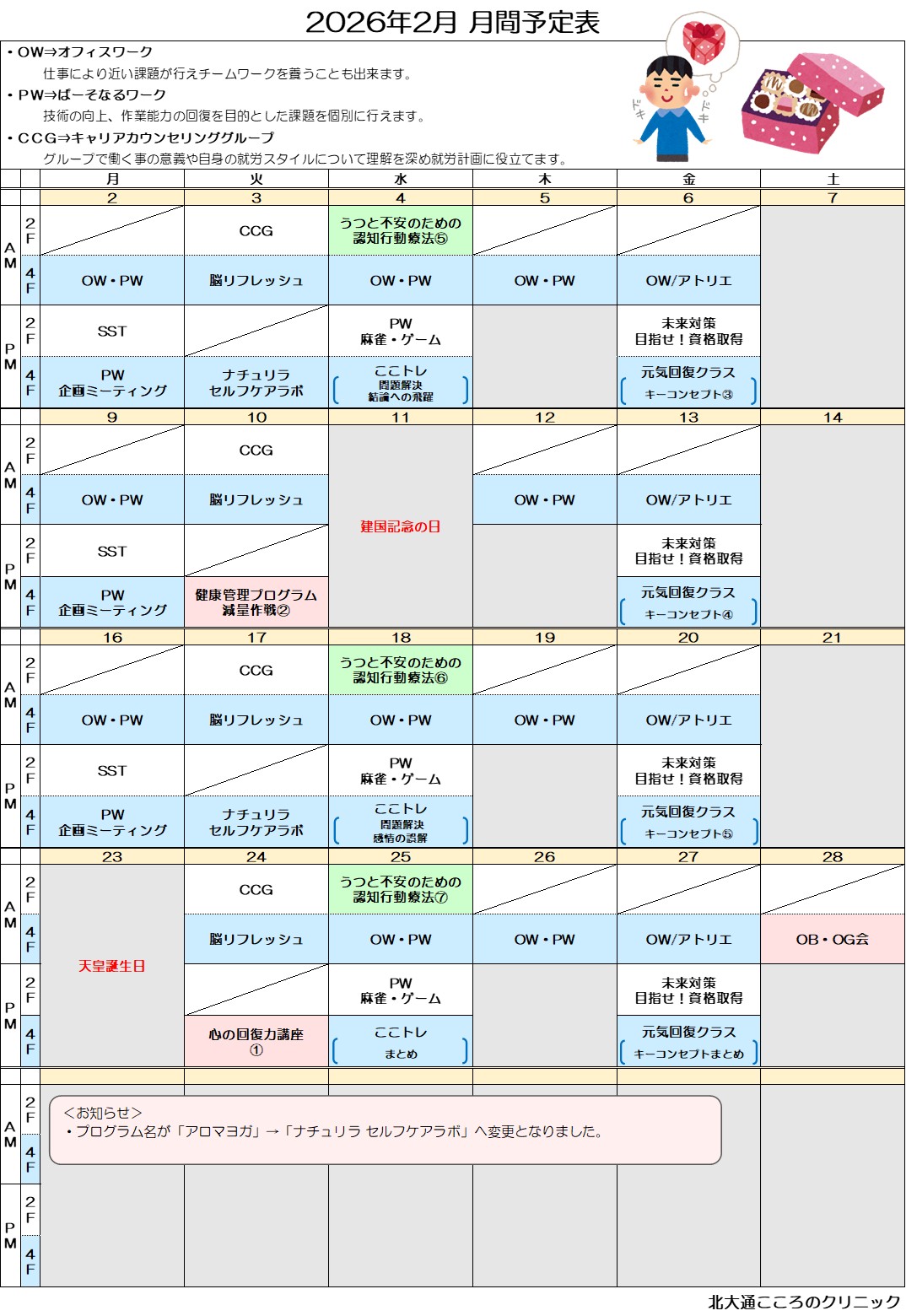 - 主治医からデイケア利用の許可が得られている方(他院通院中の方は、主治医を代わって頂くこともありますが、それぞれの方の事情によってはご相談に応じます。 現在通院中でプログラムを希望される方は、まず受診の上で、診察の際に是非ご相談ください。)